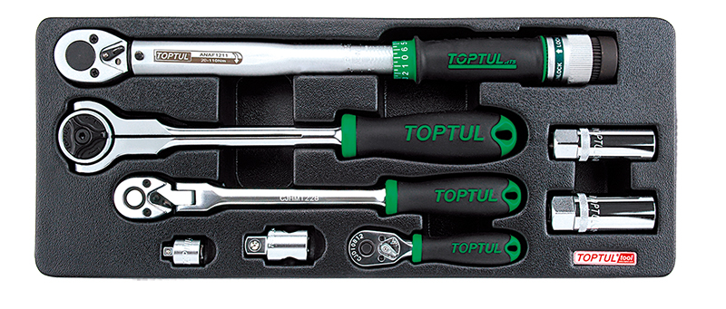 Набор трещоток 1/4", 3/8", 1/2", динамометрический ключ 3/8" 20-110 Нм, переходники и свечные головки, 8 предметов в ложементе (B) TOPTUL купить в Воронеже и других городах России